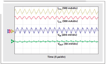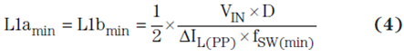 在理想緊密型耦合電感中,每個電感的單芯上都有相同的繞組數(shù),這時耦合迫使紋波電流在兩個耦合電感之間等分。在現(xiàn)實耦合電感中,電感并沒有相等的電感,并且紋波電流也不會完全相等。無論如何,在理想紋波電流值的情況下,如果存在兩個單獨的電感,則我們將耦合電感中要求的電感估算為實際需要的一半,如方程式 4 所示: