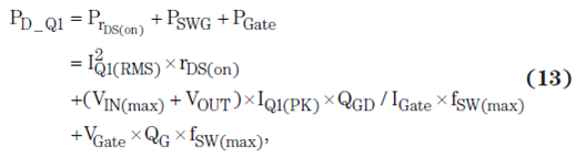 在相關(guān)環(huán)境溫度下,F(xiàn)ET 功耗額定值必須大于傳導(dǎo)損耗(FET rDS(on) 的函數(shù))和開關(guān)損耗(FET 柵極電荷的函數(shù))的和,計算方法如方程式 13 所示: