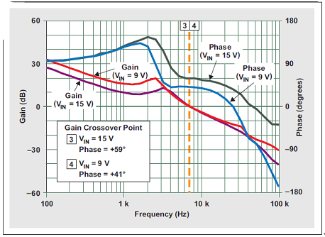 圖 7 VIN=9V 和 15V 且 IOUT=1A 時的環(huán)路響應(yīng)