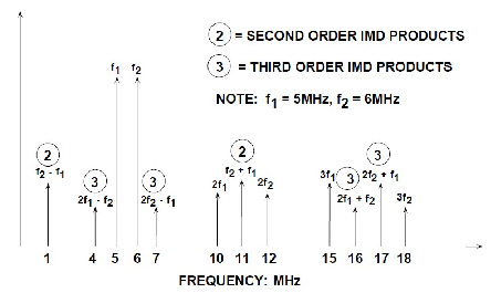 圖1:二階和三階交調(diào)積其中,f1 = 5 MHz, f2 = 6 MHz