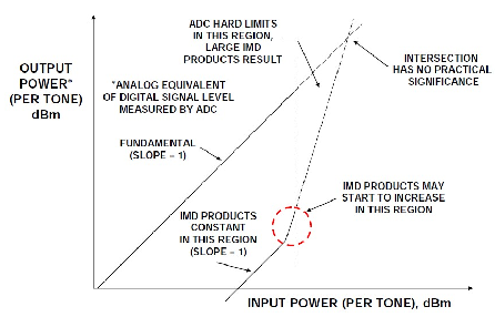 類似地,信號每增加1 dB,三階IMD (IMD3)幅度就增加3 dB,如圖中slope = 3 曲線所示。