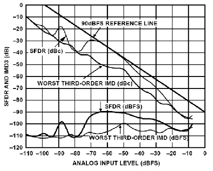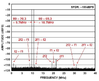 當(dāng)輸入信號處于ADC滿量程范圍的幾dB之內(nèi)時,IMD可能開始增加(但在設(shè)計(jì)優(yōu)良的ADC中可能不會如此)。出現(xiàn)這種現(xiàn)象的確切電平取決于具體的ADC--有些ADC在其滿量程輸入范圍內(nèi),其IMD積不會顯著增大,但多數(shù)ADC會。當(dāng)輸入信號繼續(xù)增加并超過滿量程范圍時,ADC應(yīng)充當(dāng)理想的限幅器,IMD積將變得非常大。出于對此類原因的考慮,ADC并無二階和三階IMD交調(diào)截點(diǎn)額定值。需要注意的是,DAC實(shí)際上存在同樣的情況。在兩種情況下,單音或多音SFDR(無雜散動態(tài)范圍)額定值是廣受認(rèn)可的數(shù)據(jù)轉(zhuǎn)換器失真性能的衡量指標(biāo)。