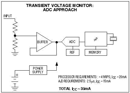 如果軟件比較具有高效編碼并且ADC無需處理器干預(yù),系統(tǒng)每次采樣可執(zhí)行少于10條指令,這就要求處理器具有4MIPS的能力。這種執(zhí)行能力并不適合采用電池供電(圖1)。需要考慮用模擬方法對輸入瞬態(tài)偏離進(jìn)行響應(yīng),用以替代連續(xù)跟蹤方案。