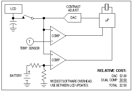 另外一種方法就是用一個低成本雙路DAC替代現(xiàn)有單路DAC.雙路DAC中的一路用于產(chǎn)生LCD對比度電壓,另一路用于構(gòu)成ADC.無論單路還是雙路,都需要DAC和比較器支持快速、驅(qū)動DAC的簡單程序,以及對比較器采樣來實(shí)現(xiàn)逐次逼近(參見sidebar,逐次逼近)。