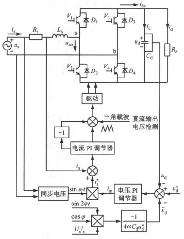 單相全橋電壓型PWM 整流器選擇響應(yīng)速度較快的三角波電流比較法作為控制策略。因反饋到電壓外環(huán)的輸出電壓含有紋波電壓,而紋波電壓的存在將導(dǎo)致電流內(nèi)環(huán)的給定電流發(fā)生畸變,因此本文采用補(bǔ)償輸出直流電壓中紋波電壓的方法[4]來減少流入電壓控制環(huán)的紋波電壓,從而改善給定電流的波形。按照以上原理設(shè)計(jì)的單相全橋電壓型PWM整流器的控制系統(tǒng)結(jié)構(gòu)如圖4所示。