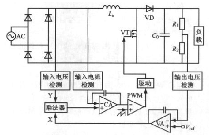 工作原理:APFC主電路的輸出電壓經(jīng)電阻分壓后與基準(zhǔn)電壓相比較,誤差值輸入到VA;VA 輸出信號(hào)X與輸入電壓檢測(cè)信號(hào)Y一起輸入乘法器,經(jīng)過平均化處理、放大、比較后,再經(jīng)過PWM 比較器加到柵極驅(qū)動(dòng)器,產(chǎn)生對(duì)開關(guān)管VT的控制信號(hào),從而使電感Ls上的電流(即輸入電流)平均值始終跟蹤模擬乘法器輸出的半正弦信號(hào),即跟蹤了輸入電壓波形,并實(shí)現(xiàn)了輸入電流正弦化,使功率因數(shù)接近1,達(dá)到校正功率因數(shù)的目的。