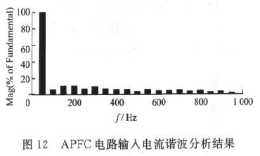 單相APFC電路采用Matlab7.6進(jìn)行建模與仿真。圖10為APFC電路輸入電壓和電流波形,可見網(wǎng)側(cè)輸入電流由窄脈沖波形變成正弦電流波形,且與輸入電壓同相位。圖11為APFC電路輸出電壓波形,可見經(jīng)過60ms的軟啟動(dòng)過程之后,輸出電壓穩(wěn)定在400V左右,滿足設(shè)計(jì)要求。圖12為APFC電路輸入電流諧波分析結(jié)果,可見除基波外,其余諧波含量均很小。