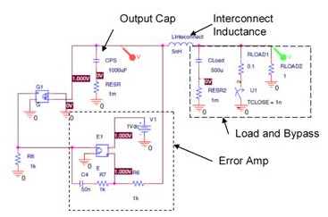 為了討論方便,圖1顯示了電源系統(tǒng)的P-SPICE模型。本圖由補償電路電源、調制器(G1)和輸出電容器組成。內部還包括互連電感、旁路電容負載模型、DC負載和步進負載。