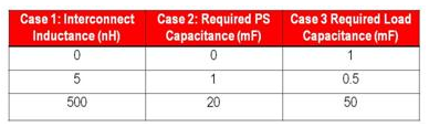 表1對舉例系統(tǒng)三個互連電感的要求電容器進行了比較。通過改變互連電感、計算負載旁路電容并設計電源的相應輸出級和控制環(huán)路,得到比較數(shù)據(jù)。案例1的負載和電源并列放置;案例2電源和負載之間的互連電感大小為中等。案例3中,使用線纜連接的電源的電感極高。要求旁路的多少直接與互連電感有關。