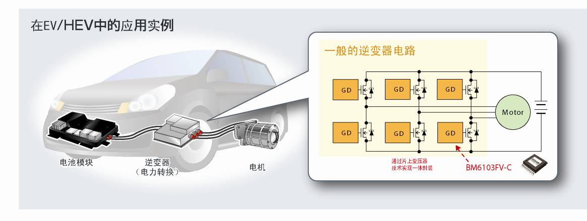 日本知名半導體制造商羅姆株式會社(總部位于日本京都市)開發出內置絕緣元件的柵極驅動器“BM6103FV-C”,最適合作為電動汽車(EV)和混合動力車(HEV)逆變回路中IGBT以及功率MOSFET的驅動元件。