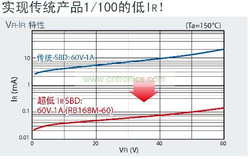 此次,羅姆通過(guò)采用最適合高溫環(huán)境的金屬,實(shí)現(xiàn)了業(yè)界頂級(jí)低IR化。與傳統(tǒng)的SBD相比,IR降低到約1/100,使高溫環(huán)境下的使用成為可能。