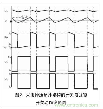 在達(dá)到預(yù)定的電壓或電流限值時,控制集成電路將開關(guān)斷開,從而使電感周圍的磁場衰減,并使偏置二極管D1正向?qū)ǎ瑥亩^續(xù)向輸出電路供給電流,直至開關(guān)再度接通。這一循環(huán)反復(fù)進(jìn)行,而開關(guān)的次數(shù)由控制集成電路來確定,并將輸出電壓調(diào)控在要求的電壓值上。圖2所示為在若干個開關(guān)循環(huán)周期內(nèi),流過電感器和其它降壓拓?fù)潆娐吩系碾妷汉碗娏鞑ㄐ巍?/p>