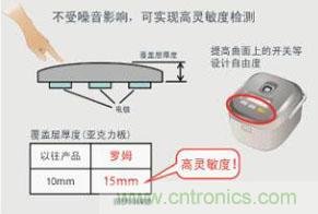 在靈敏度方面,通過獨創的高速采樣,使該產品在厚達15mm的覆蓋層中亦可使用。這使以往很難實現的在有一定厚度的圓形面板和曲面面板中應用觸控開關成為可能。