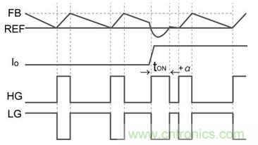 …………(公式)●tON后HG一旦關斷,低邊MOSFET的柵極(LG)導通,FB引腳電壓開始下降,當與REF電壓達到一致時關斷LG。