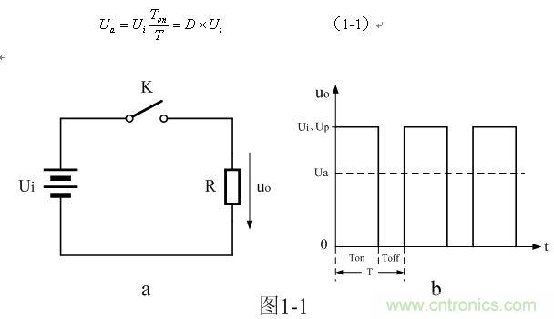 圖1-1-b是串聯式開關電源輸出電壓的波形,由圖中看出,從控制開關K輸出電壓uo是一個脈沖調制方波,脈沖幅度Up等于輸入電壓Ui,脈沖寬度等于控制開關K的接通時間Ton,由此可求得串聯式開關電源輸出電壓uo的平均值Ua為: