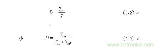 式中Ton為控制開關K接通的時間,T為控制開關K的工作周期。改變控制開關K接通時間Ton與關斷時間Toff的比例,就可以改變輸出電壓uo的平均值Ua 。一般人們都把 稱為占空比(Duty),用D來表示,即: