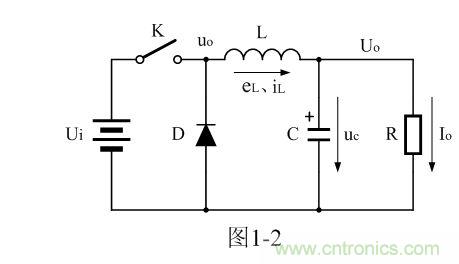 圖1-2是在圖1-1-a電路的基礎上,增加了一個整流二極管和一個LC濾波電路。其中L是儲能濾波電感,它的作用是在控制開關K接通期間Ton限制大電流通過,防止輸入電壓Ui直接加到負載R上,對負載R產生電流沖擊;同時,流過電感的電流iL又會轉化成磁能,并存儲于電感之中,然后在控制開關K關斷期間Toff電感又會把磁能轉化成電流iL繼續向負載R提供能量輸出。因此,圖1-2中的L是一個儲能濾波電感,它對流過電路中的電流起到平滑濾波的作用。