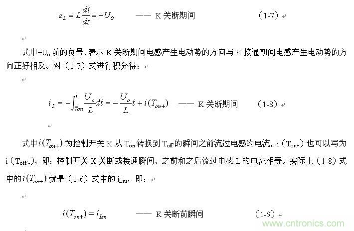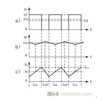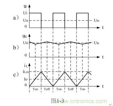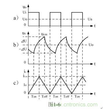在此順便說明:由于電容兩端的電壓變化量ΔU相對于輸出電壓Uo來說非常小,為了簡單,我們這里把Uo當成常量來處理。在某種情況下,當我們需要對電容的初次充、放電過程進行分析時,必須需要建立微分方程,并求解。當開關電源剛開始工作時,由于輸出電壓Uo的建立需要一定的時間,因此,輸出電壓Uo的建立也需要一個過渡過程,如對此過渡過程進行精確計算,得出的結果中一般都含有一指數函數項,當令時間變量等于無窮大時,即電路進入穩態時,再對相關參量取平均值,其結果就基本與(1-4)相等。