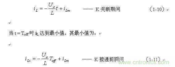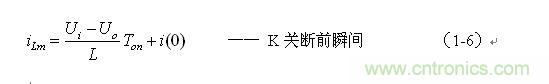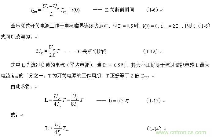 串聯式開關電源最好工作于電流臨界連續狀態,或連續電流狀態。此時,開關電源輸出電壓的調整率為最好,且輸出電壓Uo的紋波也不大。因此,我們可以從電流臨界連續狀態著手進行分析。我們先看(1-6)式: