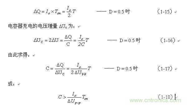 同理,(1-17)和(1-18)式的計算結果,只給出了計算串聯式開關電源儲能濾波電容C的中間值,或平均值,由于輸出電流的不確定性,實際應用時,可以以此為極限,在此平均值的計算結果上再乘以一個大于1的系數。