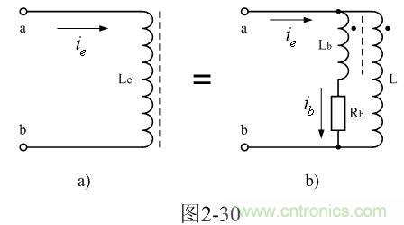 圖2-30-a中,Le是一個(gè)同時(shí)考慮渦流損耗因素的電感;L是變壓器原初級(jí)線圈的電感;Rb是鐵芯渦流損耗電阻;Lb是一個(gè)互感線圈,通過它把流過電阻Rb的電流感應(yīng)到變壓器初級(jí)線圈中;當(dāng)流過電阻Rb的電流增加時(shí),流過通過Lb互感線圈的感應(yīng)作用,使流過變壓器初級(jí)線圈L的電流也同時(shí)增加。