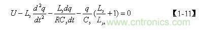 圖4中,當電源開關管Q1導通時,設輸入電壓為U,流過Ls的電流為 i,流過Cs的電流為i1 ,流過Lu 的電流為i2 ,流過R的電流為i3 ,Cs存儲的電荷為q,如果忽略Lds的作用,則列出回路方程為: