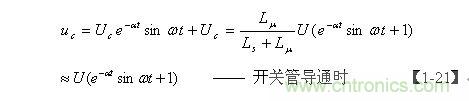【1-21】式是當電源開關管Q1導通時,分布電容Cs兩端電壓隨時間變化的表達式,它由兩部分電壓組成,一部分是電容Cs兩端電壓的半波平均值Uc ,由【1-19】式表示;另一部分是正弦阻尼振蕩,其最大振幅等于 Uc, e-at是一個小于1的衰減系數。
