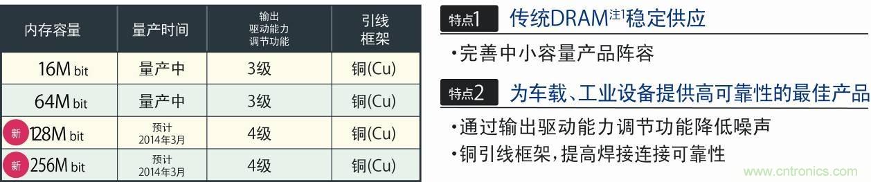 另外,DRAM的主流產品逐漸向大容量、高速化的DDR2/DDR3-SDRAM發展,中小容量SDRAM的供應越來越不穩定。LAPIS Semiconductor將中小容量的SDRAM定位為傳統DRAM注1,作為唯一可長期供貨的日本國內制造商,不僅面向車載用途市場,而且面向更廣闊的工業設備市場,正在不斷完善產品的產品陣容。