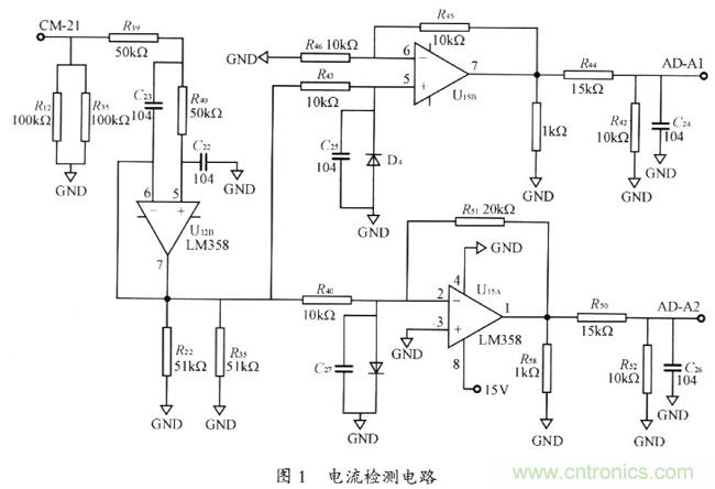 電池充放電電流的大小尤為關鍵。電路圖如圖1所示,因為是既檢測充電電流也檢測放電電流,故在小電阻上的電壓又是兩個方向,在電路檢測中用兩個通道分別檢測,這樣也便于分別進行信號的調理,同時也便于用A/D轉換器的一個輸入通道來測量。