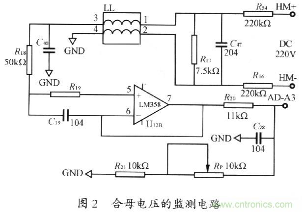 合母電壓監測電路如圖2所示。合母電壓流過電阻R16、R17、R54,在電阻R17上取樣,故而電阻R17應選用高精度電阻。R16和R54因為要比電阻R17大得多,又是出現在分母上,故而不必選用高精度電阻。LL的作用是抑制共模干擾??梢酝ㄟ^調節電位器Rp的大小來使所要監測電壓的大小符合A/D轉換器輸入電壓要求。