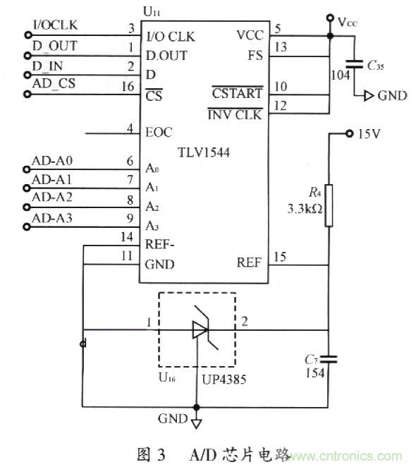 A/D轉換芯片采用TLV1544。TLVl544的主要特點是:寬范圍的單電源供電,VCC可為2.7~5.5V;芯片內部有著較高的轉換速率,轉換時間小于10μs;芯片提供4路外部輸入通道,通過編程給芯片不同的狀態字設置可以任意選擇4個輸入通道之一;芯片有4個端口作為同步串行接口,通過SPI總線的形式與微處理器連接;11位A/D轉換,足以滿足系統的要求。如圖3所示。