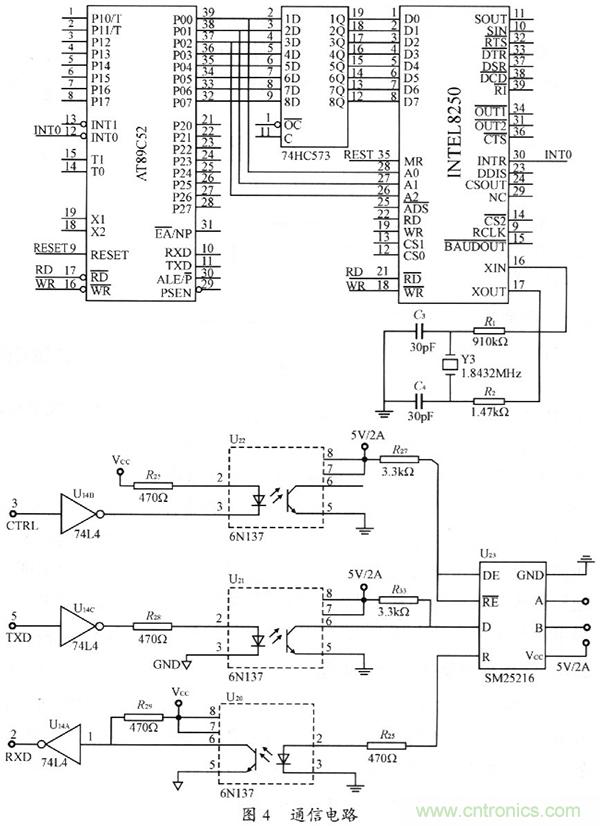 整個系統內部通過RS485進行通信。具體電路如圖4所示。因為控制芯片都采用AT89C52,作為主監控單元CPU只有一個串口,而其并口也沒有充分利用起來,故通過可編程串行接口芯片8250擴展串口,用并口來模擬串口。