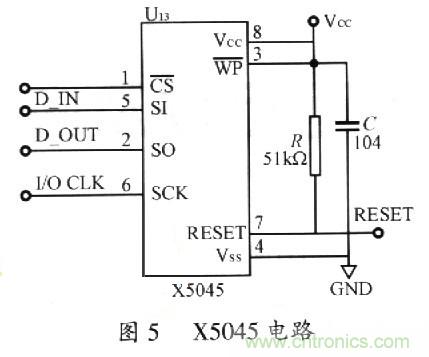 X5045電路的設計如圖5所示。本器件將四種功能合于一體:上電復位控制、看門狗定時器、降壓管理以及具有塊保護功能的串行EEPROM。它有助于簡化應用系統的設計,減少印制板的占用面積,提高可靠性。將其與CPC以SPI總線方式連接,讀寫簡單,其內部的EEPROM還可以保護一些重要數據。
