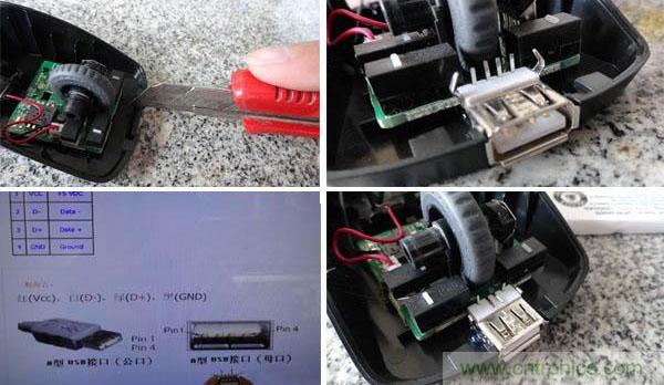 開USB座口,引腳定義,只要兩邊的兩個(gè)腳,也就是+5V和地。