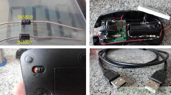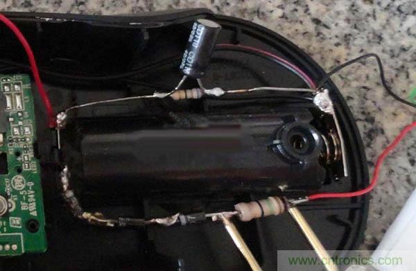 新加的鋰電正極通過15歐限流電阻和三個(gè)IN4007降壓,接到原電池正極,給鼠標(biāo)供電。
