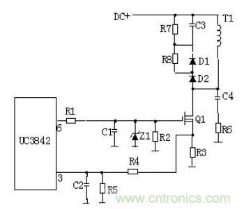 R4、C3、R5、R6、C4、D1、D2組成緩沖器,和開關MOS管并接,使開關管電壓應力減少,EMI減少,不發生二次擊穿。在開關管Q1關斷時,變壓器的原邊線圈易產生尖峰電壓和尖峰電流,這些元件組合一起,能很好地吸收尖峰電壓和電流。從R3測得的電流峰值信號參與當前工作周波的占空比控制,因此是當前工作周波的電流限制。當R5上的電壓達到1V時,UC3842停止工作,開關管Q1立即關斷。