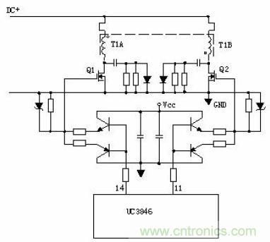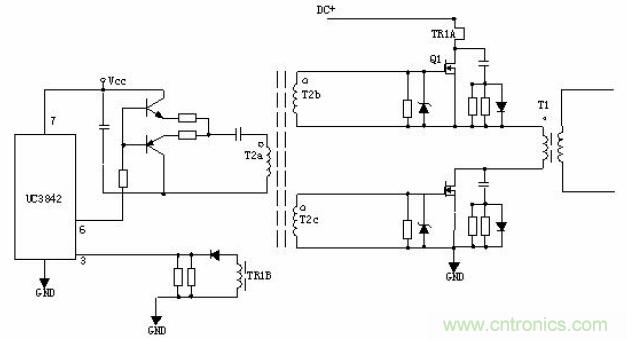 5、有驅動變壓器的功率變換電路:T2為驅動變壓器,T1為開關變壓器,TR1為電流環。