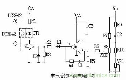 當輸出U0降低時,U1③腳電壓降低,當其低過U1②腳基準電壓后U1①腳輸出低電平,Q1不導通,光耦OT1發光二極管不發光,光電三極管不導通,UC3842①腳電位升高,從而改變U1⑥腳輸出占空比增大,U0降低。周而復始,從而使輸出電壓保持穩定。調節VR1可改變輸出電壓值。