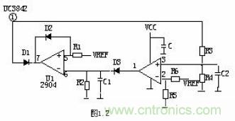 取樣電壓分為兩路,一路經R1、R2、R3、R4分壓后輸入比較器3腳,如取樣電壓高于2腳基準電壓,比較器1腳輸出高電平去控制主控制器使其關斷,電源無輸出。另一路經R7、R8、R9、R10分壓后輸入比較器6腳,如取樣電壓低于5腳基準電壓,比較器7腳輸出高電平去控制主控制器使其關斷,電源無輸出。