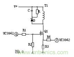 當輸出電路短路或過流,變壓器原邊電流增大,R3 兩端電壓降增大,③腳電壓升高,UC3842⑥腳輸出占空 比逐漸增大,③腳電壓超過1V時,UC3842關閉無輸出。