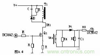 T1為開關變壓器,其初極和次極的相位同相。D1為整流二極管,D2為續流二極管,R1、C1、R2、C2為削尖峰電路。L1為續流電感,C4、L2、C5組成π型濾波器。
