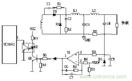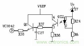 當輸出U0升高,經取樣電阻R7、R8、R10、VR1分壓后,U1③腳電壓升高,當其超過U1②腳基準電壓后U1①腳輸出高電平,使Q1導通,光耦OT1發光二極管發光,光電三極管導通,UC3842①腳電位相應變低,從而改變U1⑥腳輸出占空比減小,U0降低。