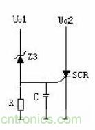 如上圖,當Uo1輸出升高,穩壓管(Z3)擊穿導通,可控硅(SCR1)的控制端得到觸發電壓,因此可控硅導通。Uo2電壓對地短路,過流保護電路或短路保護電路就會工作,停止整個電源電路的工作。當輸出過壓現象排除,可控硅的控制端觸發電壓通過R對地泄放,可控硅恢復斷開狀態。