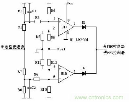 Q1關斷時施放能量。D1是啟動二極管。D2是PFC整流二極管,C6、C7濾波。PFC電壓一路送后級電路,另一路經R3、R4分壓后送入PFC控制器作為PFC輸出電壓的取樣,用以調整控制信號的占空比,穩定PFC輸出電壓。