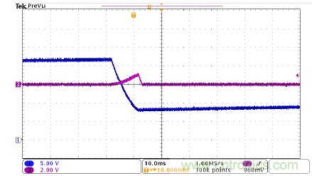 圖4是UCC28700的啟動(dòng)波形,CH1是MOSFET柵極驅(qū)動(dòng)信號(hào),CH3是輸出電壓。該器件啟動(dòng)順暢,沒有過沖和聲頻噪聲。該圖顯示,UCC28700器件有非常好的啟動(dòng)性能。在圖4中,tstart接近18ms,與計(jì)算結(jié)果吻合。