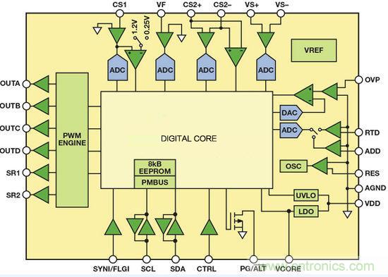 該器件非常適合高密度DC-DC電源轉換,具有6個可編程脈沖寬度調制(PWM)輸出,可控制大部分高效電源拓撲。另外,該器件還能控制同步整流(SR),并集成6個模數轉換器(ADC),能夠采樣模擬輸入電壓、輸入電流、輸出電壓、輸出電流、溫度以及其它參數。轉換為數據后,將這些信號發送至數字內核模塊進行處理。該器件采用靈活的狀態機架構,以硬件實現全部功能,提供穩定可靠的解決方案,但無法通過編程實現設計以外的功能。器件的全部功能--包括輸出電壓調整--均以數字方式處理。為了調整輸出電壓,應通過PMBus接口發送一條命令,改變數字基準電壓值。
