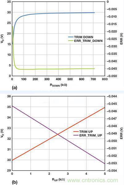 圖6:使用重新配置的反饋網絡后,調整ADP1051輸出電壓的計算結果:(a)向下調整 (b)向上調整