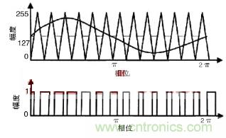 本系統采用自然采樣法產生SPWM波,以正弦波為調制波,等腰三角波為載波進行比較,在兩個波形的自然交點時刻控制開關器件的通斷。其優點是所得SPWM波形最接近正弦波,但由于三角波與正弦波交點有任意性,脈沖中心在一個周期內不等距,從而脈寬表達式是一個超越方程,若采用實時計算的方式得到SPWM波的話,計算繁瑣,非MSP430所能勝任。本系統充分利用MSP430的定時器,搭建了一個簡易的DDS;讓其計數器作增減計數構成三角波載波,再把正弦波表作為數組預先存入MSP430中,我們只需在定時器中斷中更新比較寄存器數值即可得到調制正弦波。由于MSP430定時器自帶比較功能,兩者比較即可得到SPWM波輸出,繼而撇開了繁瑣的超越方程求解。最終我們利用此方法得到的SPWM波濾波后的正弦波失真度達到了0.5%。圖4是自然采樣原理圖。