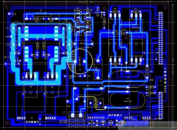 下面是功率主板的PCB截圖,長寬為200X150MM,因為,這部分的電路比較簡單,就不給出原理圖了,直接畫了PCB圖,如圖1所示。