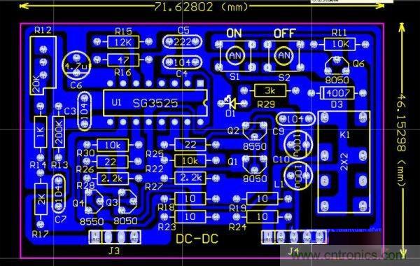 DC-DC升壓驅動板,采用的是很常見的線路,用一片SG3525實現PWM的輸出,后級用二組圖騰輸出,經實驗,如果用一對190N08,圖騰部分可以省略,直接用3525驅動就夠了。板上有二個小按鈕開關,S1、S2、S1是開機的,S2是關機的,可以控制逆變器的啟動和停機。